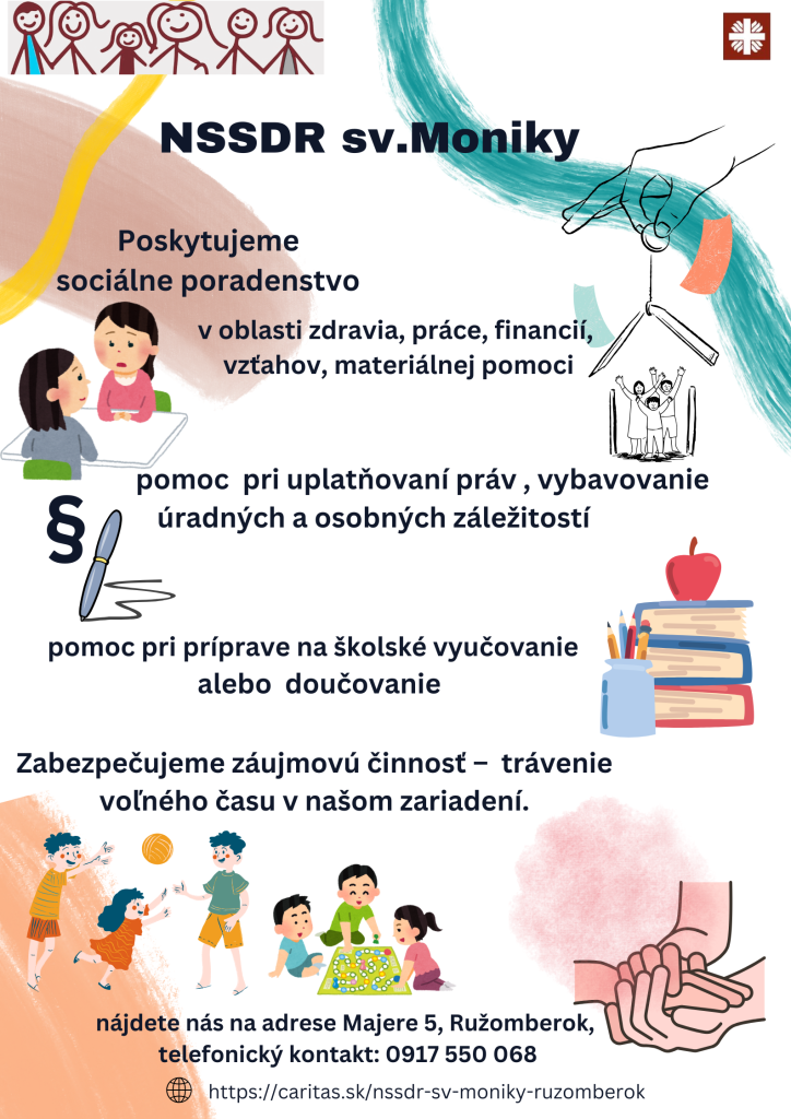 Nízkoprahová sociálna služba pre deti a rodinu sv. Moniky, sídliaca na Majere 5 v Ružomberku, je súčasťou Národného projektu „Terénna sociálna práca a komunitné centrá“ Ministerstva práce, sociálnych vecí a rodiny SR. Táto služba je poskytovaná osobám v nepriaznivej sociálnej situácii, ohrozeným sociálnym vylúčením alebo s obmedzenou schopnosťou spoločenského začlenenia. Cieľom je poskytovať sociálne poradenstvo, pomoc pri uplatňovaní práv a záujmovú činnosť. Medzi ponúkané aktivity patria tvorivé dielne pre deti, hernička pre mamičky s deťmi, chlapčenská klubovňa a senior klub. Viac informácií nájdete na webovej stránke organizácie.